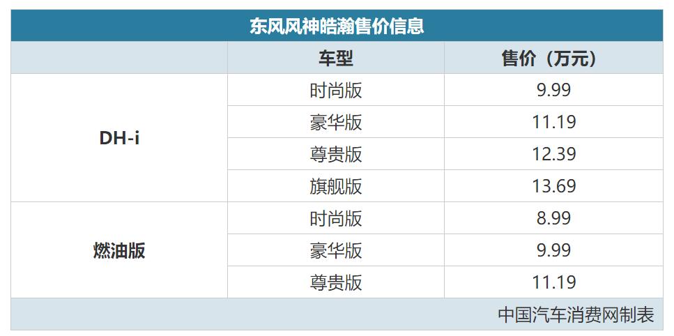 [新车上市]8月12日,东风风神皓瀚DH-i正式上市,共推出4个配置车型,售价区间为9.99-13.69万元,搭载马赫电混DH-i技术,百公里综合油耗低至4.2L,0百加速快至6秒。皓瀚燃油版同步上市,售价区间为8.99-11.19万元;而1.5T插混版本车型将在明年一季度上市。具体售价信息参见下表...